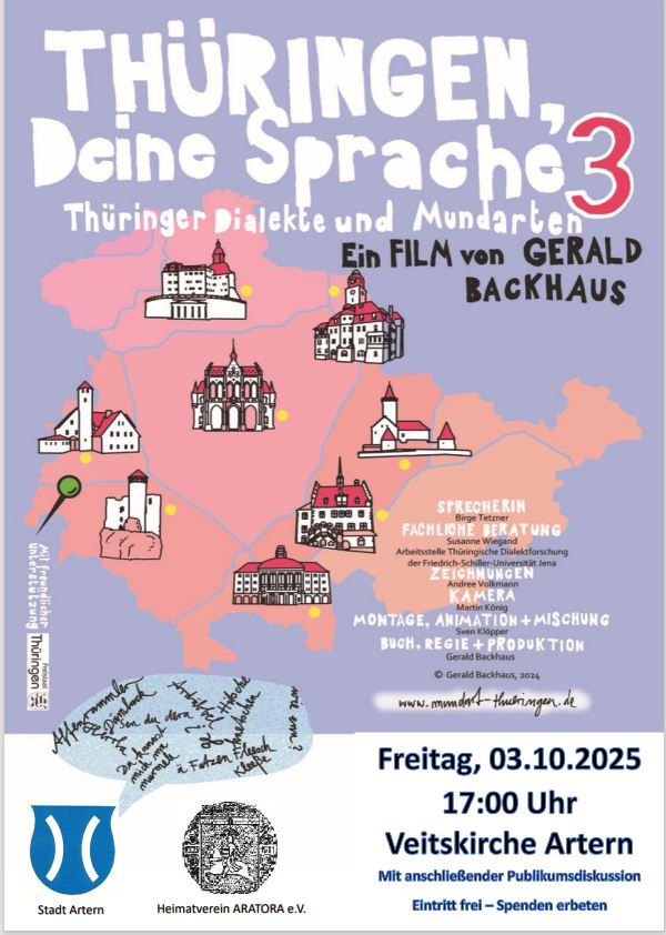 Der Dokumentarfilm Thüringen, „Deine Sprache 3“ von Gerald Backhaus wird zum Zwiebelmarkt am 03.10.2025, 17:00 Uhr in der Veitskirche Artern gezeigt.